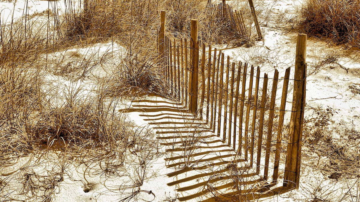 These sand fences are installed to prevent erosion and stabilize the protected areas of Atlantic beaches. Sepia tone with shadows brought out of areas out in the direct sunlight.