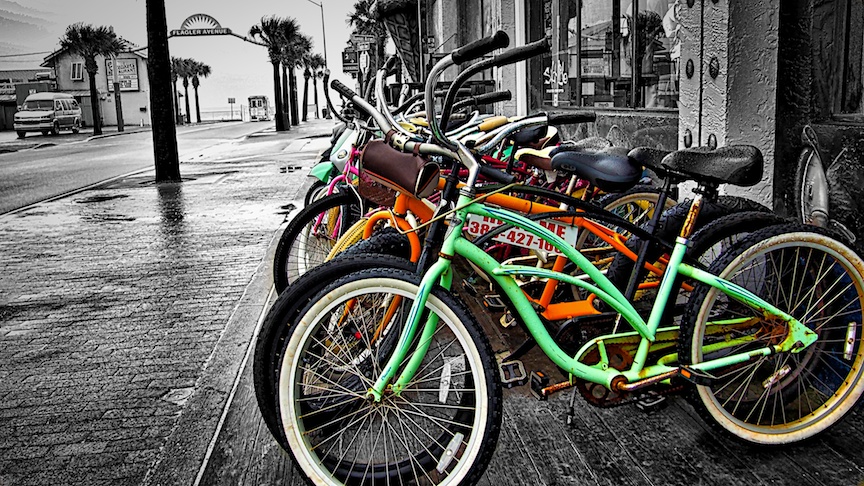 Taken in New Smyrna Beach FL USA on a rainy day. Removed color from some areas to emphasize the bikes.